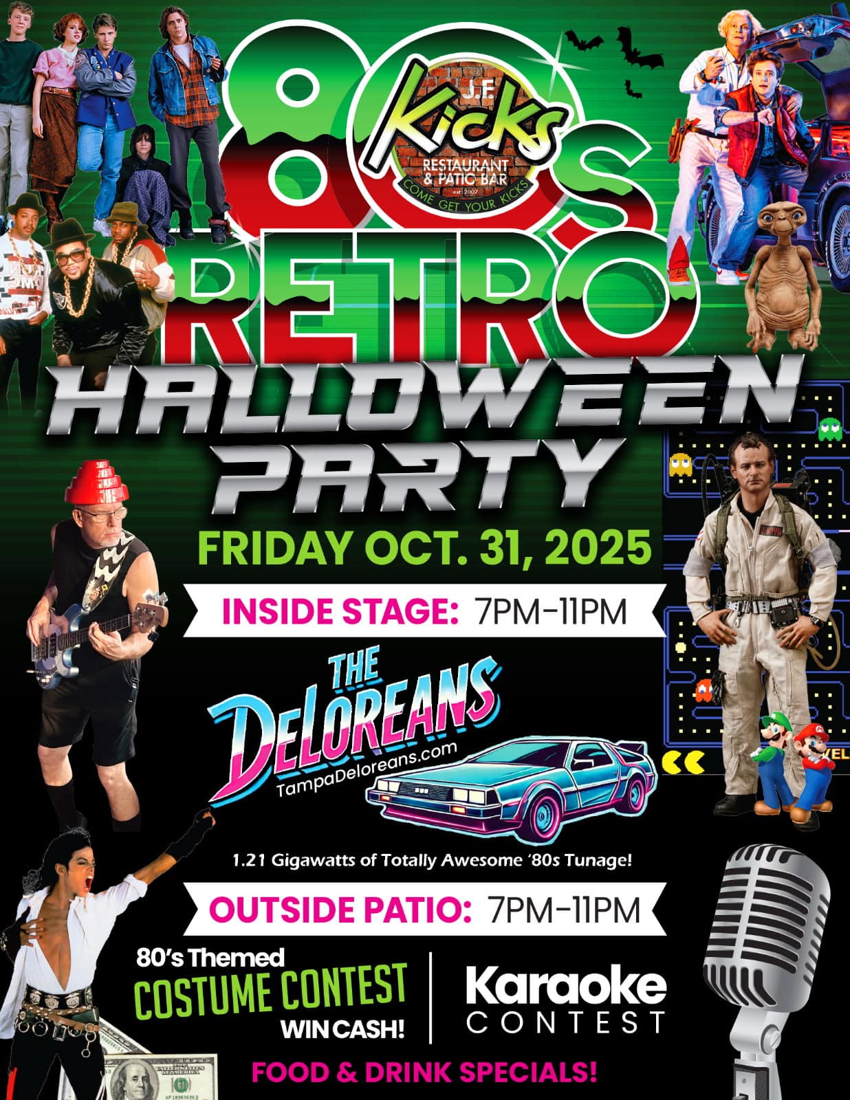 Have a monster good time at the 80’s Retro Halloween Party at JF Kicks! The DeLoreans will be playing all your 80’s faves. Get on a totally tubular costume from the 80’s and get ready to party inside and on our beautiful covered patio! Tons of fun, great music, food and drink specials, a Karaoke Contest, 80’s Themed Costume Contest, and more!
