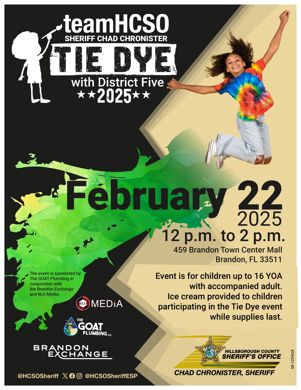 The Hillsborough County Sheriff’s Office is hosting a tie-dye with District Five event! Join #teamHCSO at the Brandon Town Center Mall on Saturday, February 22, 2025, from 12 p.m. to 2 p.m. to participate while supplies last! There will also be ice cream for children. This event is for children 16 and younger, and an adult must accompany all children.