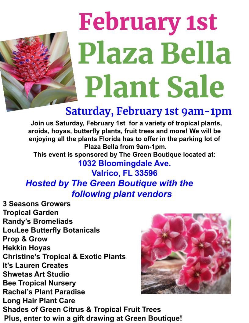 Join us for our monthly multi-vendor plant sale in the front of Plaza Bella shopping center at 1032 Bloomingdale Ave Valrico, Fl 33596. Free to attend. Interested in becoming a vendor? Message Green Boutique directly or call 813-685-9494. Any comments made by others posing as event coordinators are spam.