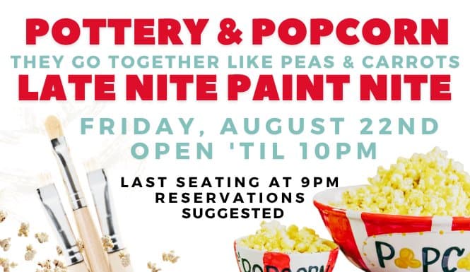 Make it a family night, a friends night, or just a night for fun! We’re staying open late for a laid-back evening filled with creativity, community, and complimentary popcorn to snack on while you paint.