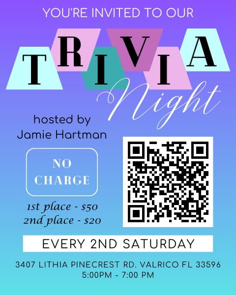 Mark your calendars and spread the word! See you every second Saturday for Trivia Night with Jamie Hartman – where learning, fun, and friendship come together. 🎊🎈