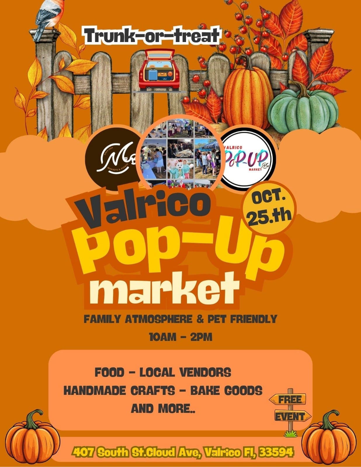 Mark your calendars, Valrico! Join us Saturday, Oct. 25th from 10am to 2pm at the Valrico Pop-up Market for a fun-filled day of shopping, food, trunk or treat and community vibes!